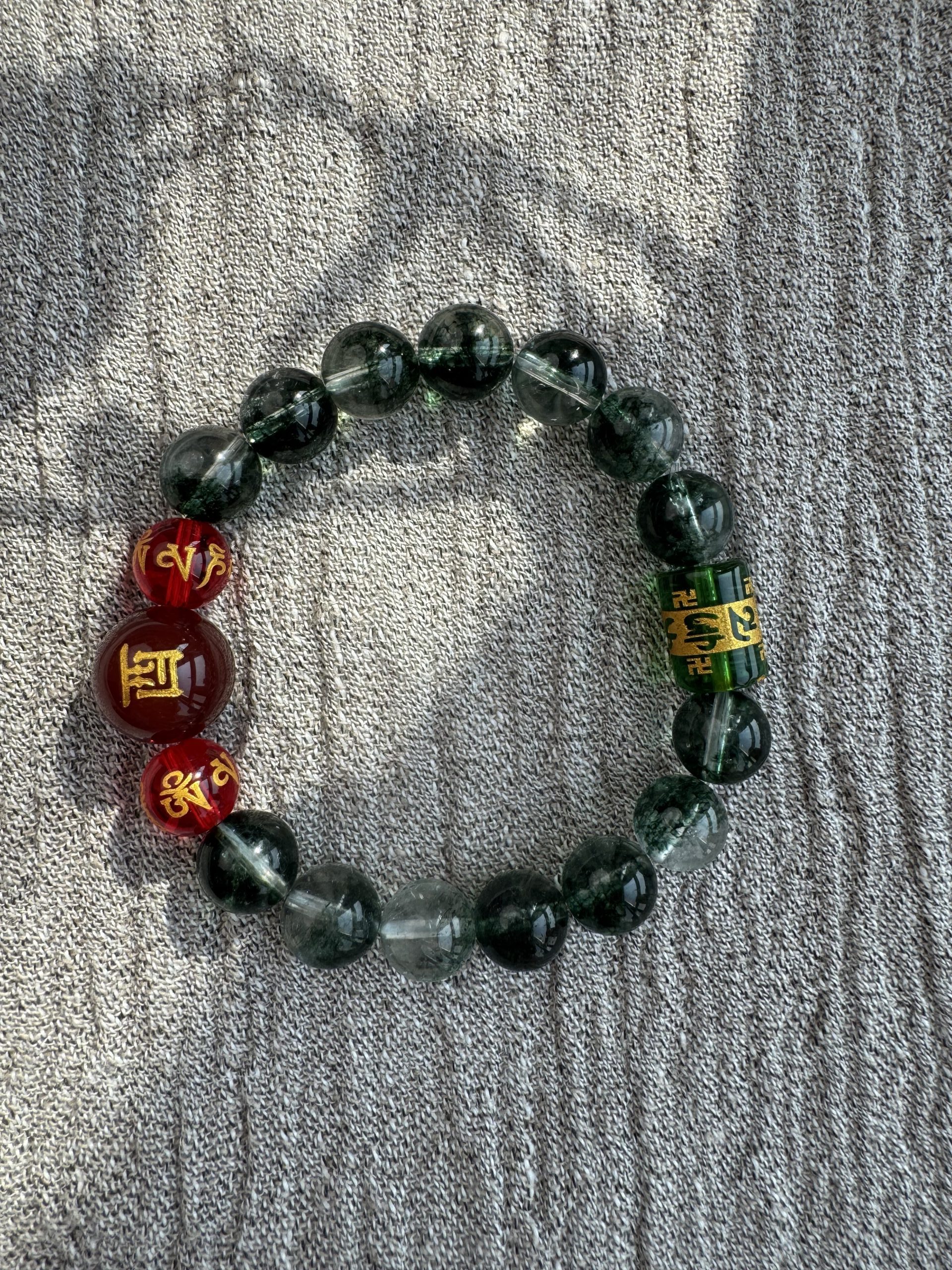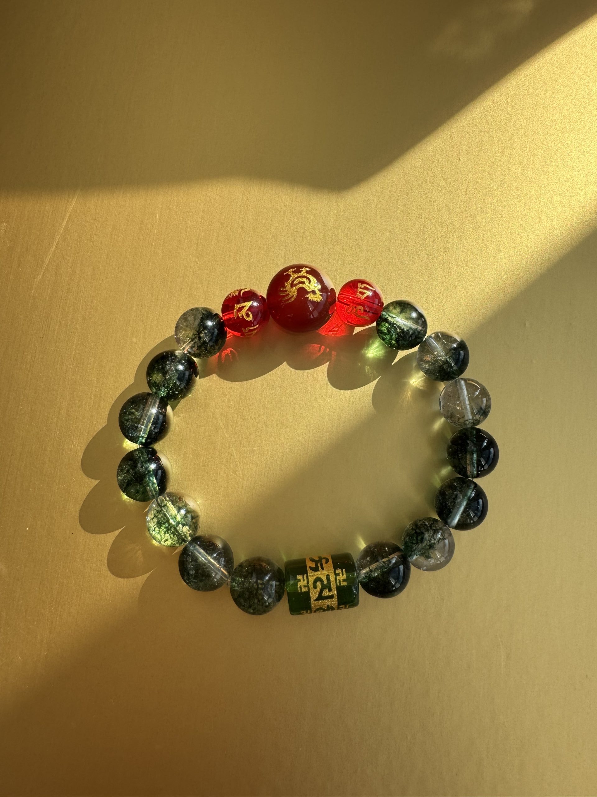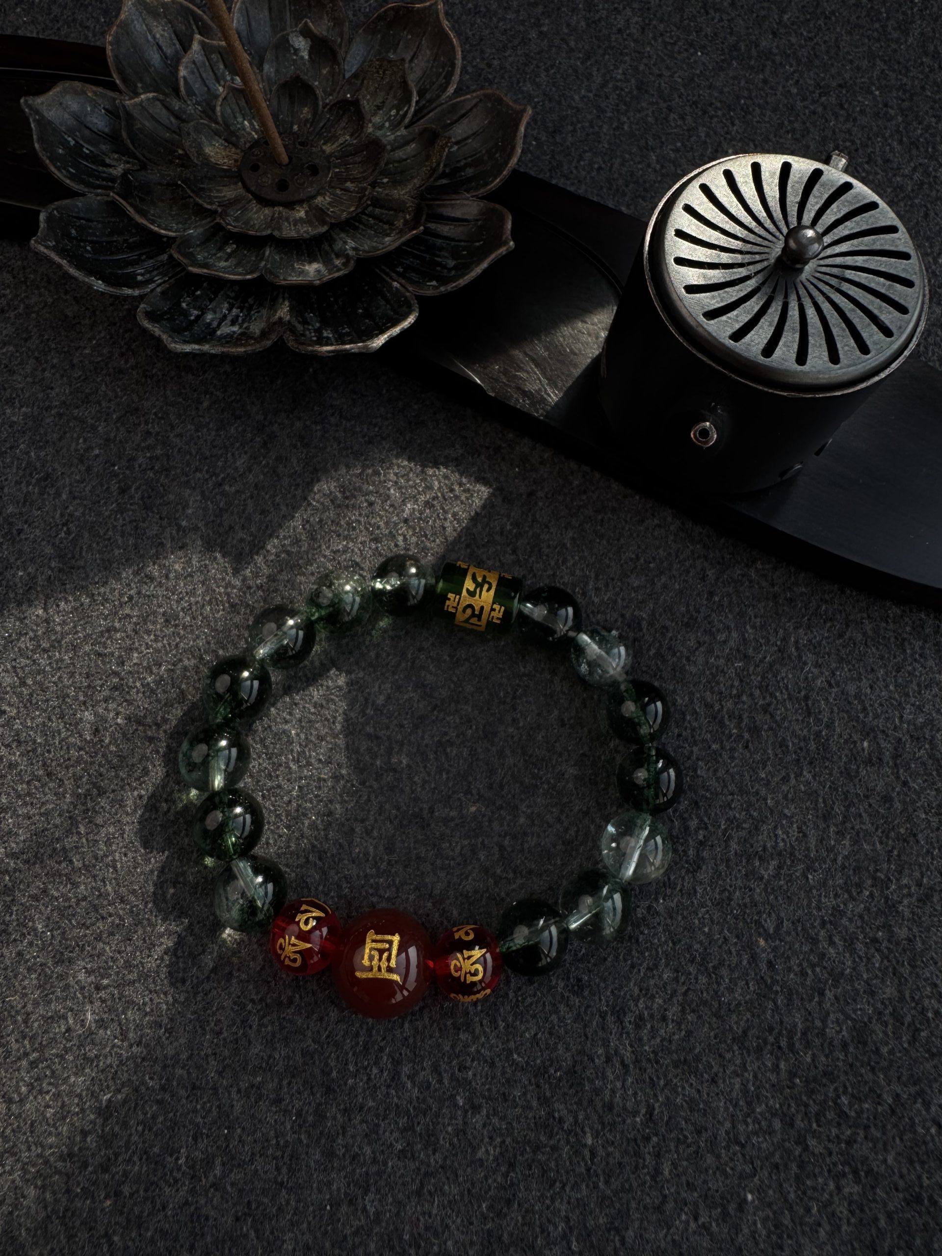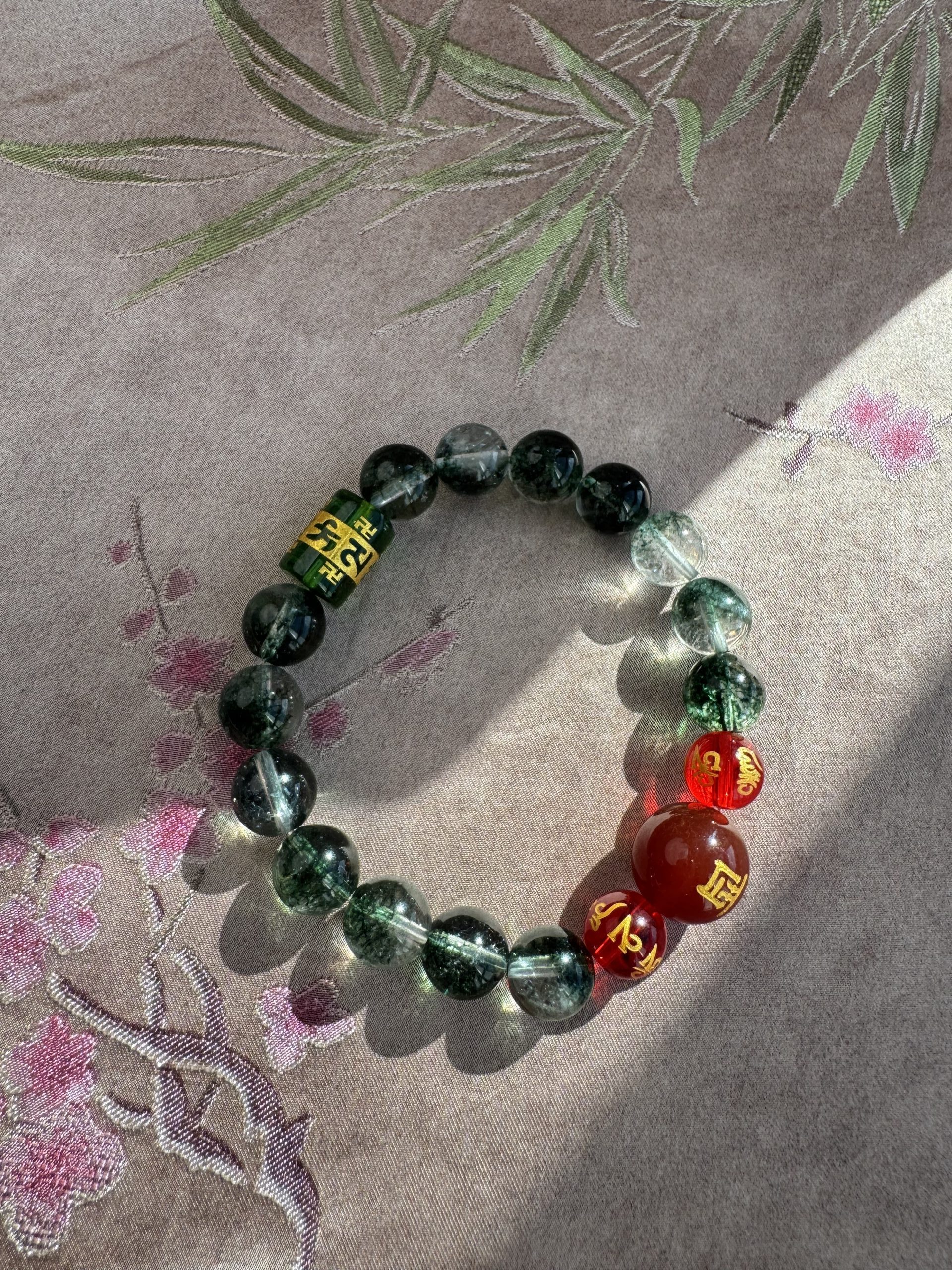 Green Phantom Quartz, like an azure dragon’s breath, stirs Wood Qi to rise; Red Agate Zodiac, like a phoenix taking flight, ignites the Li Fire; The six-syllable Sanskrit mantra transforms into a Samadhi True Flame barrier.