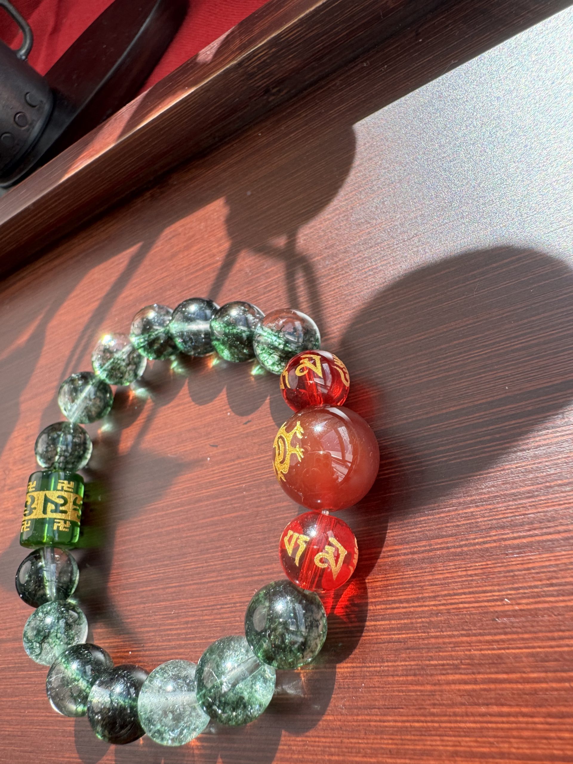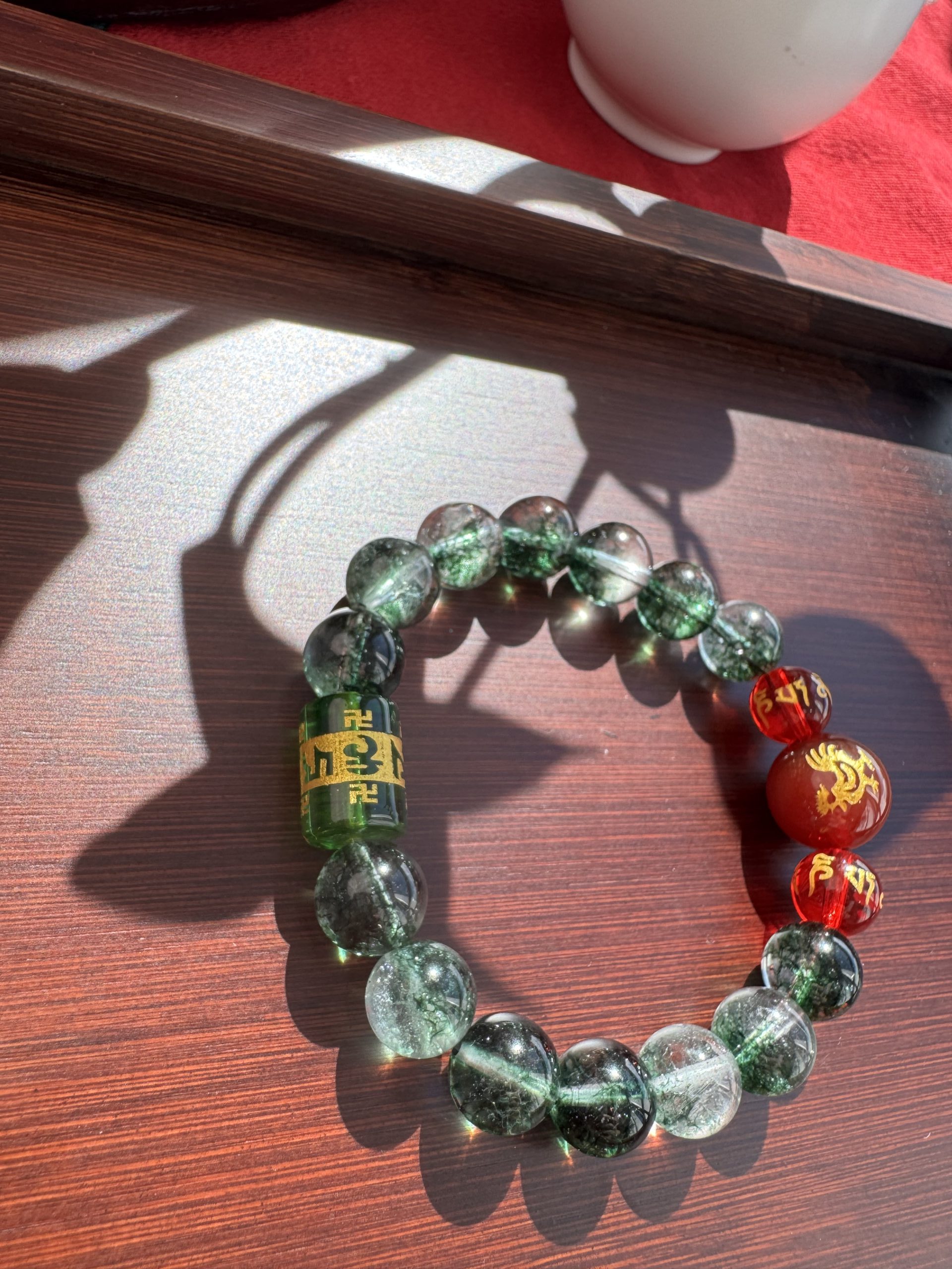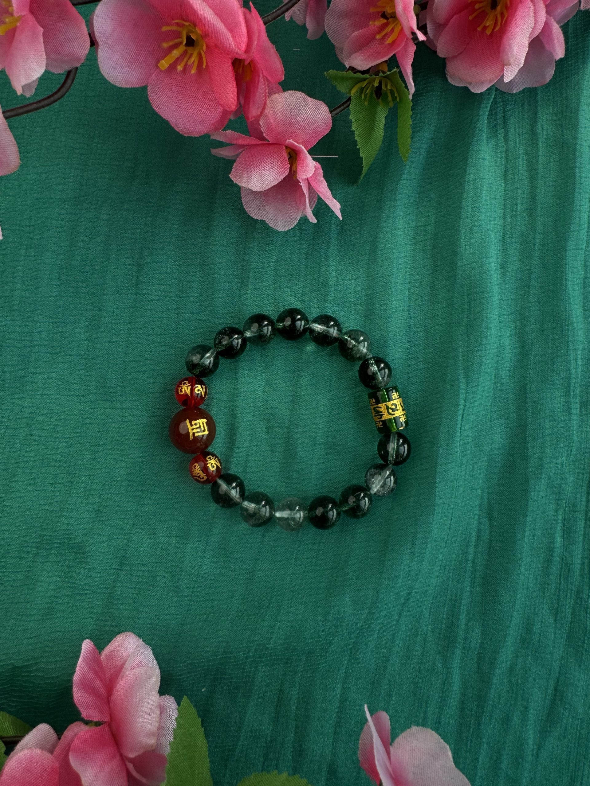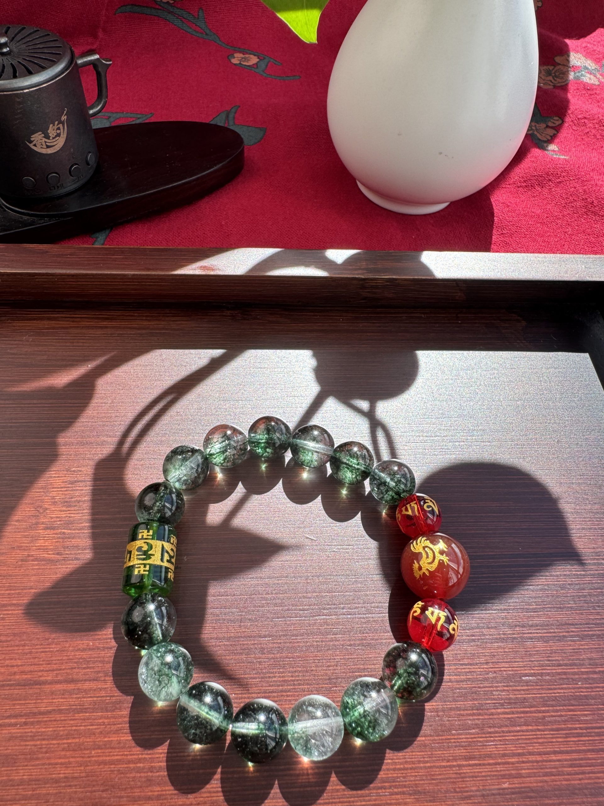 Green Phantom Quartz, like an azure dragon’s breath, stirs Wood Qi to rise; Red Agate Zodiac, like a phoenix taking flight, ignites the Li Fire; The six-syllable Sanskrit mantra transforms into a Samadhi True Flame barrier.